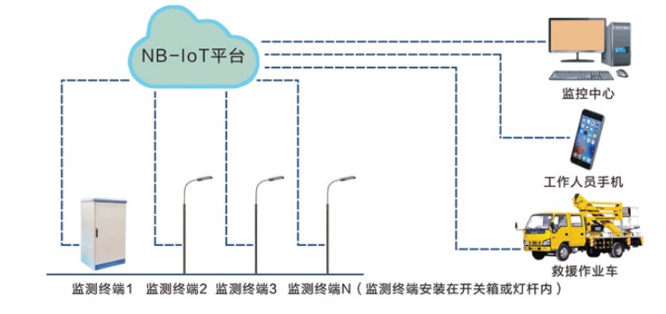 系統采用NB-IoT網絡通訊技術對城市公共照明設施(燈桿、開關箱等)進行漏電監測報警,以便對漏電故障進行快速處理,保證照明設施的安全運行,為公民的人身安全提供可靠的保障。
