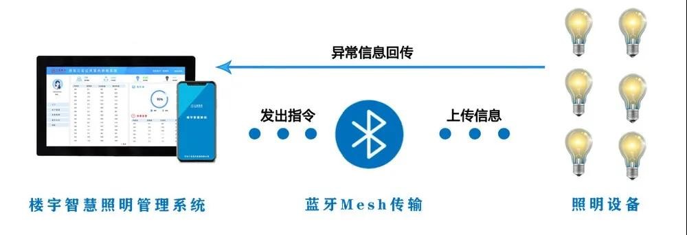 采用藍牙Mesh控制方案,通過分布式Mesh組網,實現無線/遙控系統對照明設備進行動態控制。照明控制系統可通過控制終端設備或手機APP進行管控,同時可接入管控區域物聯網監控平臺進行一體化管理。系統由藍牙Mesh燈(
