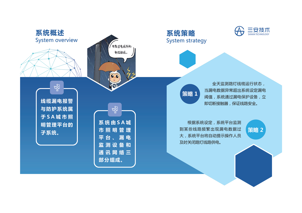 城市路燈數量較大,點多面廣,運行周期長,路燈供電線路、電纜、路燈桿、燈源等設備時常會產生漏電現象,特別是在遇到暴雨、雷電、臺風、地震等自然災害時,道路積水、燈桿倒塌等因素都可能使路燈線纜漏電及燈桿帶電,最為嚴重的是由于路燈線路老化、安裝不規范等而導致的路燈線路漏電問題,路燈燈桿分布在城市的大街小巷,極易被人接觸,尤其雨天漏電更加危險。如果路燈監控設施不具備漏電防護措施,將會使城市照明系統存在著極大的安全隱患,增加了事故的可能性。城市路燈漏電預警與防護系統可實現對城市照明設施的7x24小時連續監測,使管理人員能夠準確掌握城市照明系統的在線監測數據和存在漏電安全隱患的線路,及時進行維護、檢修、應急處理,避免線路帶病運行,對于保證照明設施的安全運行具有很重要的作用。